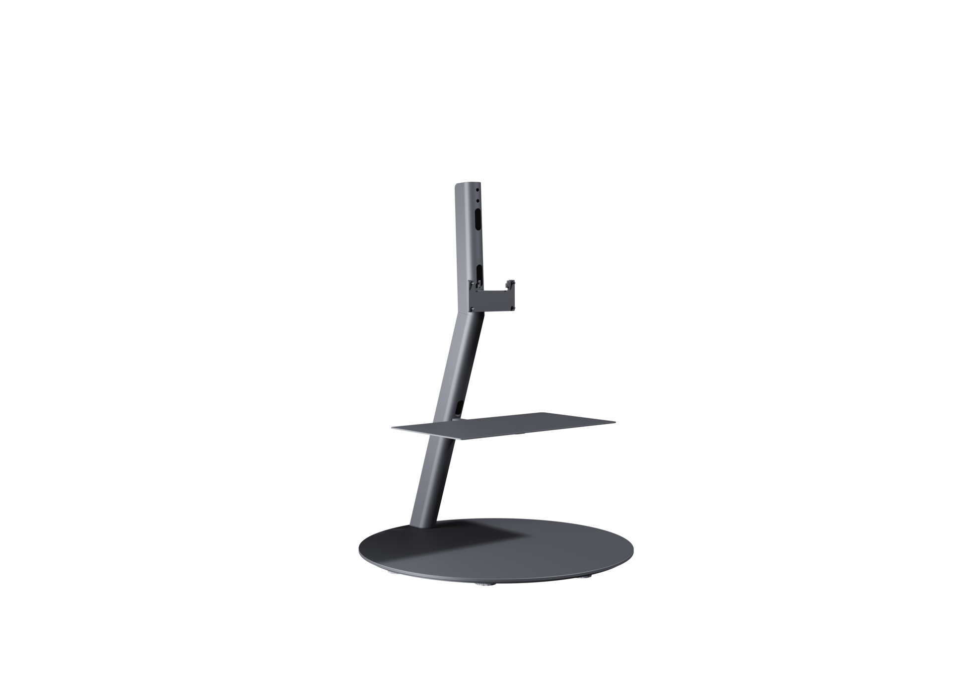 Elegante drehbare Bodenaufstelllösung mit verdeckter Kabelführung. Erweiterbar mit bis zu drei Zubehörablagen oder der Adaption für die klang bar i.