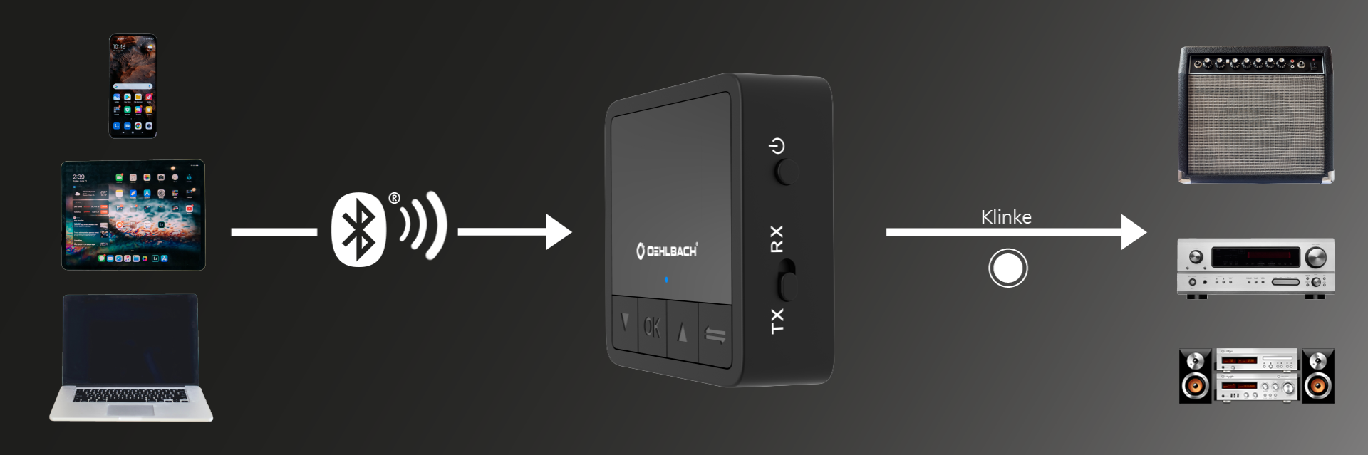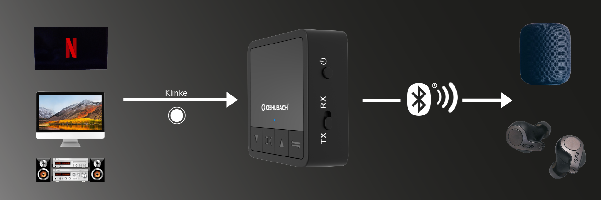 Die Bluetooth®-Wortmarke und -Logos sind eingetragene Warenzeichen im Besitz der Bluetooth SIG, Inc. und jede Verwendung solcher Marken durch Oehlbach erfolgt unter Lizenz. Andere Marken und Handelsnamen sind die ihrer jeweiligen Eigentümer. Qualcomm aptX und die aptX-Logos sind Eigentum von Qualcomm Technologies, Inc. und/oder seiner Tochtergesellschaften. Die Verwendung wird gewährt. Das Qualcomm aptX - Low Latency Logo ist Eigentum von Qualcomm Technologies, Inc. und/oder seiner Tochtergesellschaften. Die Verwendung wird gewährt. Das Qualcomm aptXHD Logo ist Eigentum von Qualcomm Technologies, Inc. und/oder seiner Tochtergesellschaften. Die Verwendung wird gewährt.